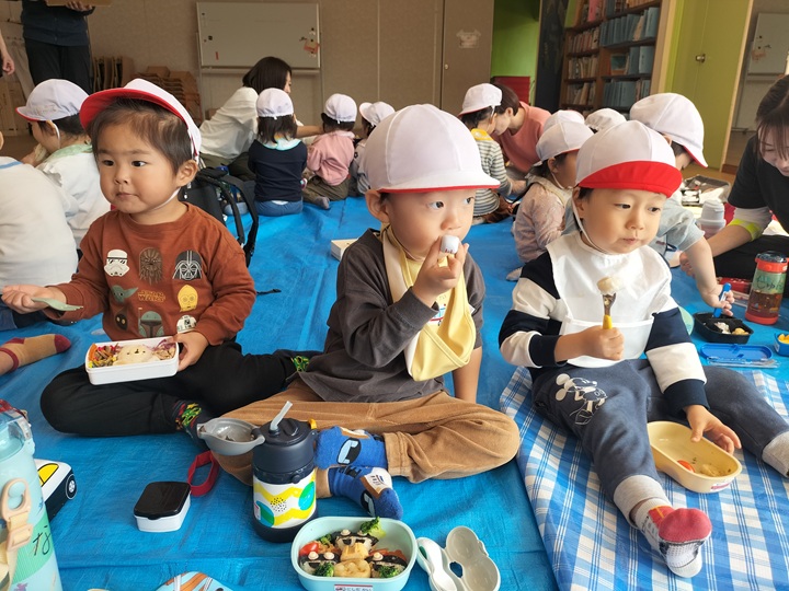幼稚園のホールでうれしいお弁当を食べました☆