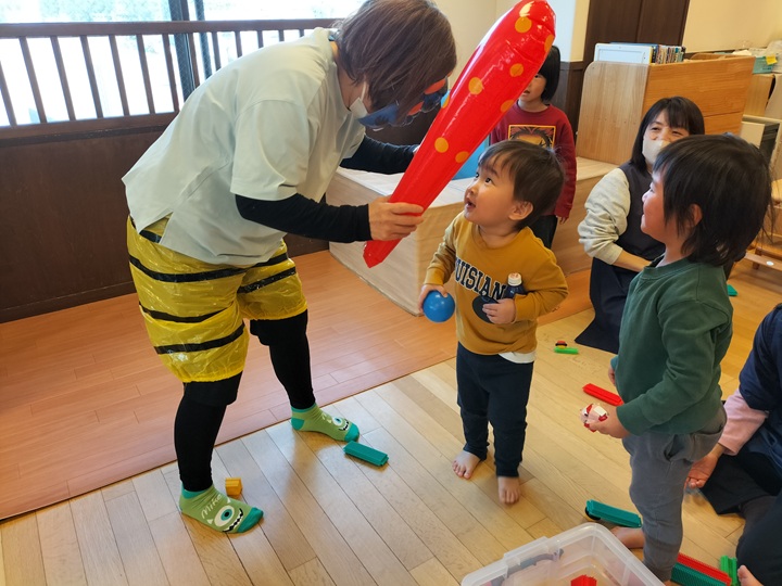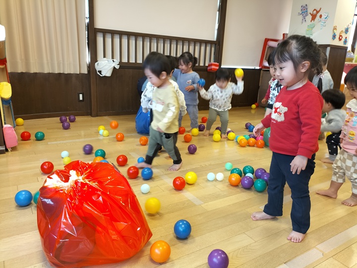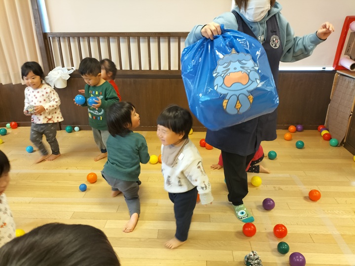 ポリ袋の鬼にボールをあてるゲームをしました♪