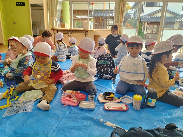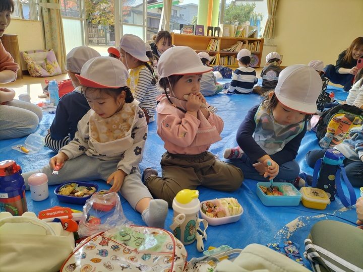 幼稚園のホールでうれしいお弁当を食べました☆