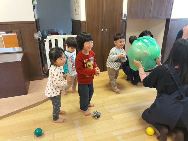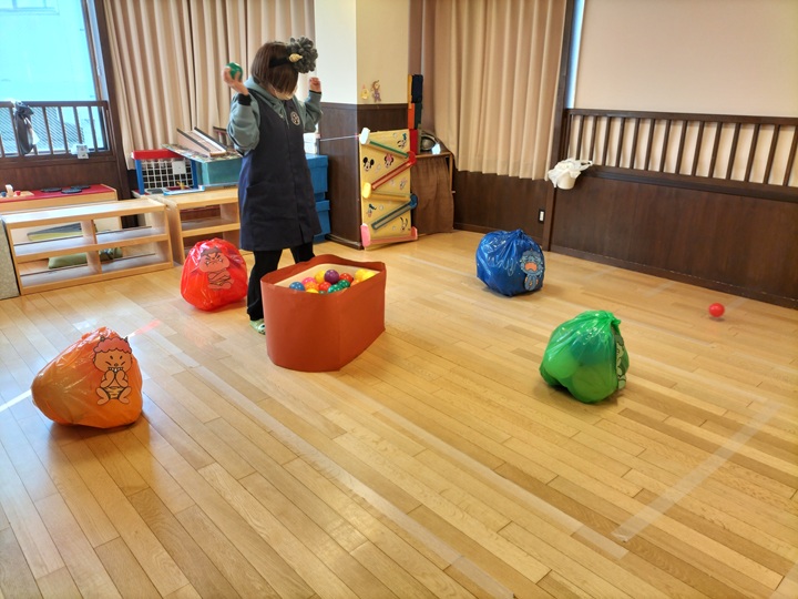 ポリ袋の鬼にボールをあてるゲームをしました♪