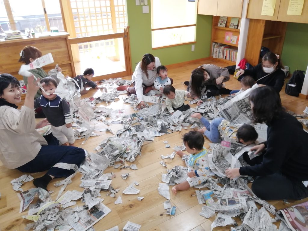 11月は新聞をたくさん使った遊びをしました。 ママと一緒に楽しいね♪ ビリビリ♪♪ 上手にちぎれたね! 新聞でオバケも作ったよ☆ 新聞のおふろにザブーン!! おふろの車もあったよ♪ 楽しい新聞遊びでした☆ -