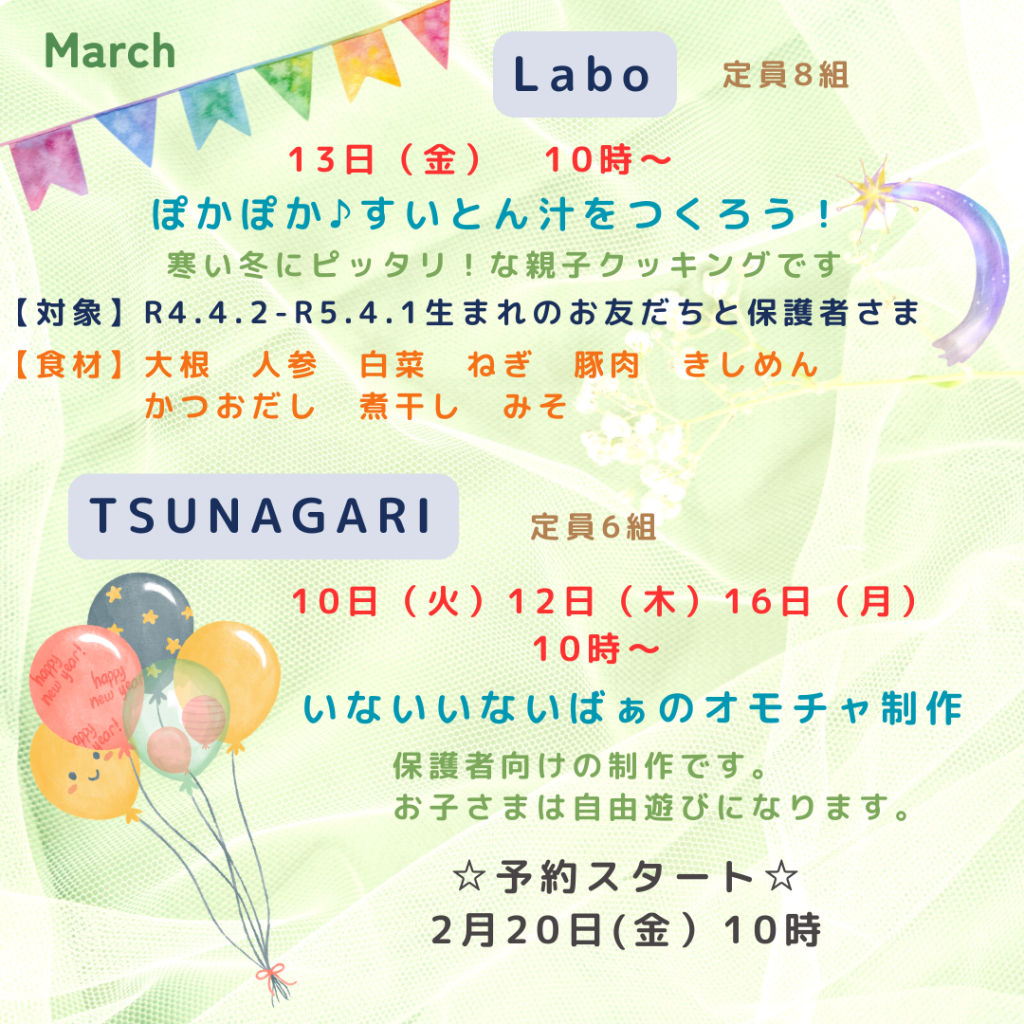 ご予約はweb受付のみです。公式LINEのメニューバーに予約受付のタブがございます。 お知らせ この記事が気に入ったら フォローしてね! Follow Me よかったらシェアしてね! URLをコピーする URLをコピーしました! URLをコピーしました! 2月開所日時変更のお知らせ 3月開所日時変更 関連記事 3月開所日時変更 2026年2月16日 2月開所日時変更のお知らせ 2026年1月29日 2月イベントのお知らせ 2026年1月19日 1月開所日時変更のお知らせ 2025年12月23日 1月イベントのお知らせ 2025年12月16日 12月開所日時変更のお知らせ 2025年11月27日 12月イベントのお知らせ 2025年11月18日 11月開所時間変更のお知らせ 2025年11月4日